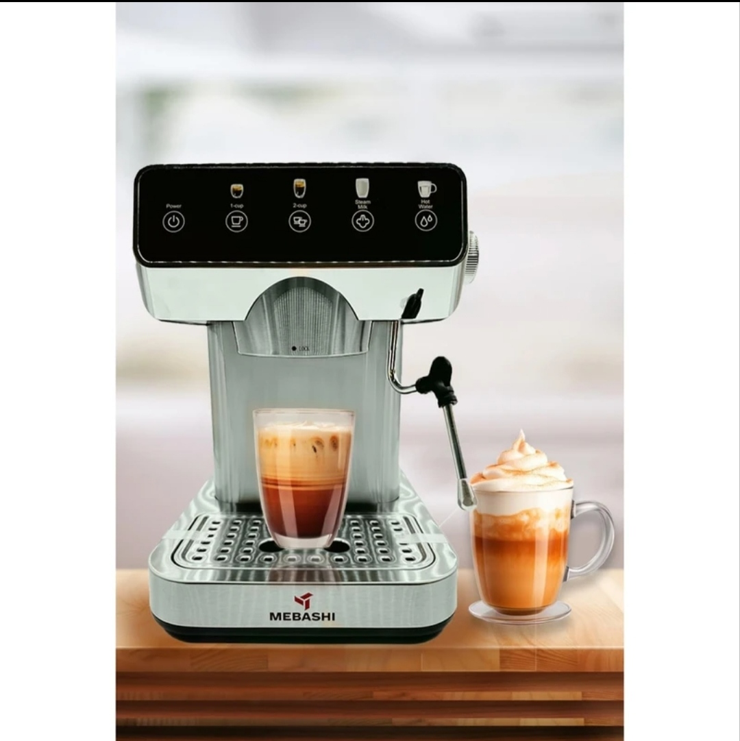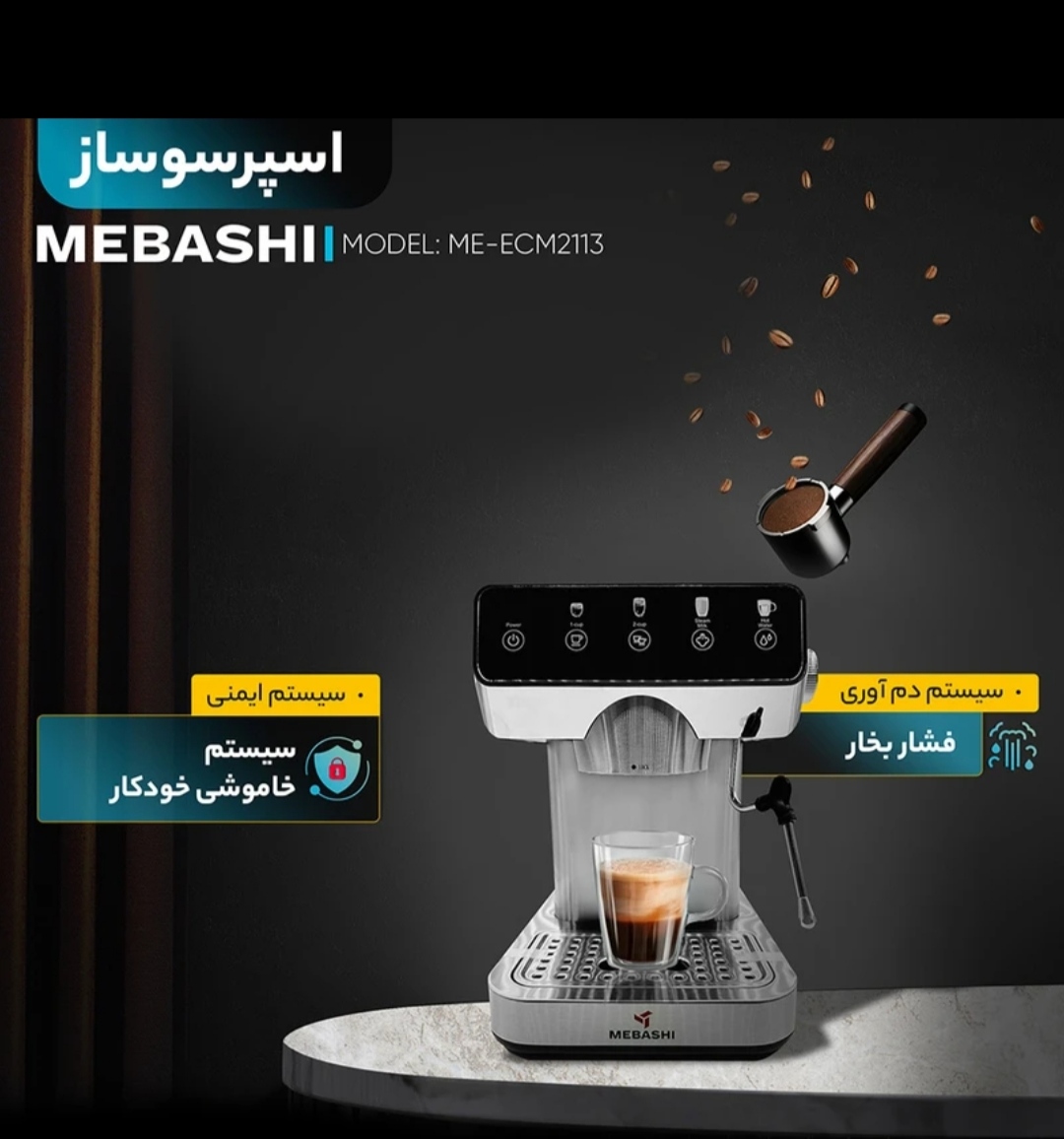 اسپرسو ساز خانگی ۱/۲لیتر مباشی مدل ۲۱۱۳ نیمه اتوماتیک که با مصرف پودر قهوه مناسب تهیه اسپرسو کاپوچینو دارای یک نازل قهوه و تنظیم بخار دهی